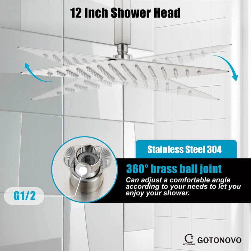 - 【12" Shower Head 】: large 12-inch raining sprinkler mixes water with air to increase the water pressure to 100%, and simulates the natural raining to provide you with natural contact of water experience.
