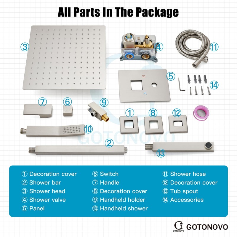 【What’s Included】: 12 Inch (30 cm*30 cm) Ceiling Mounted Shower Head, shower head, shower arm, handheld shower holder, handheld shower, rough-in valve, Installation Instructions and all install hardware.