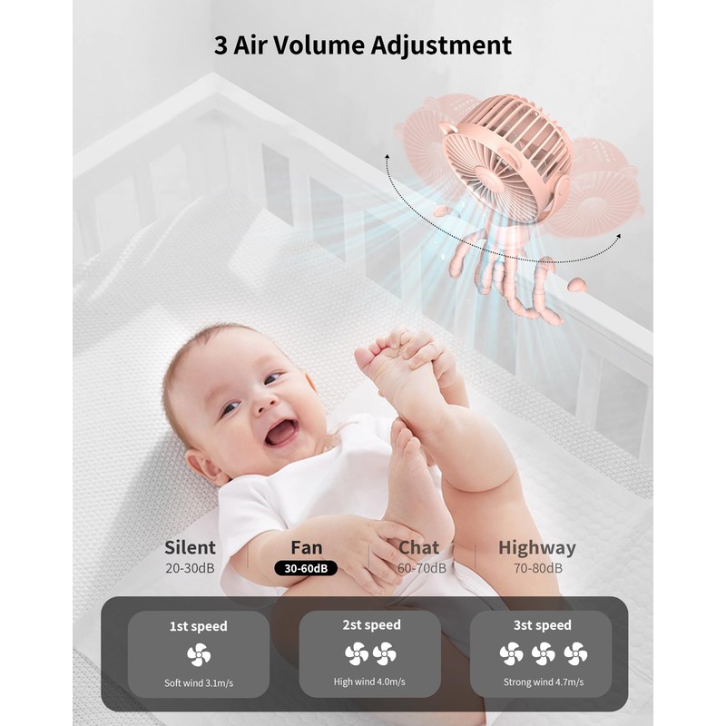• [3 Wind Speeds] Tailor your comfort with three wind speeds of our travel fan at your fingertips. Effortlessly switch between modes to suit indoor, outdoor, and parenting needs with a single click.