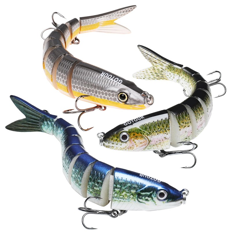 - 8 SEGMENTS REALISTIC LURES: Designed with 8 segmented body sections, GOTOUR fishing lures can sink slowly and deliver a natural S-shaped swimming action at any speed, which will bring on quicker bites.
