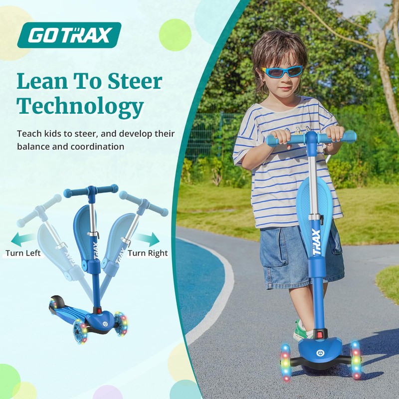 Gotrax KS3 Kids Kick Scooter, LED Lighted Wheels, Adjustable Height Handlebars and Removable Seat, Lean-to-Steer & Widen Anti-Slip Deck, 3 Wheel Scooter for Kids Ages 2-8 and up to 100 Lbs (Blue)