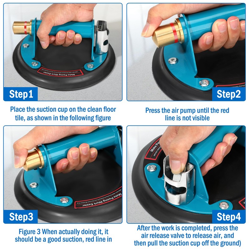 • Pressure Indication: (1) press the handle to extract air (2) slowly press the safety red line into the suction pump. (3) please pay attention to red line at all time, when the red cue line appears, vacuum is being lost. (4)After the construction is completed, press the air release valve to release air quickly.