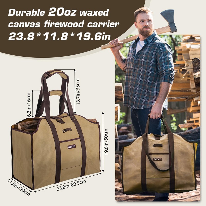 Goture 20oz Waxed Canvas 23.8×11.8×19.6 inch Firewood Carrier Bag, Waterproof Large Firewood Bag with Dual-Handles, Sealed Side, Side Pocket, and Axe Ring for Camping Indoors (with Kindling Bag)