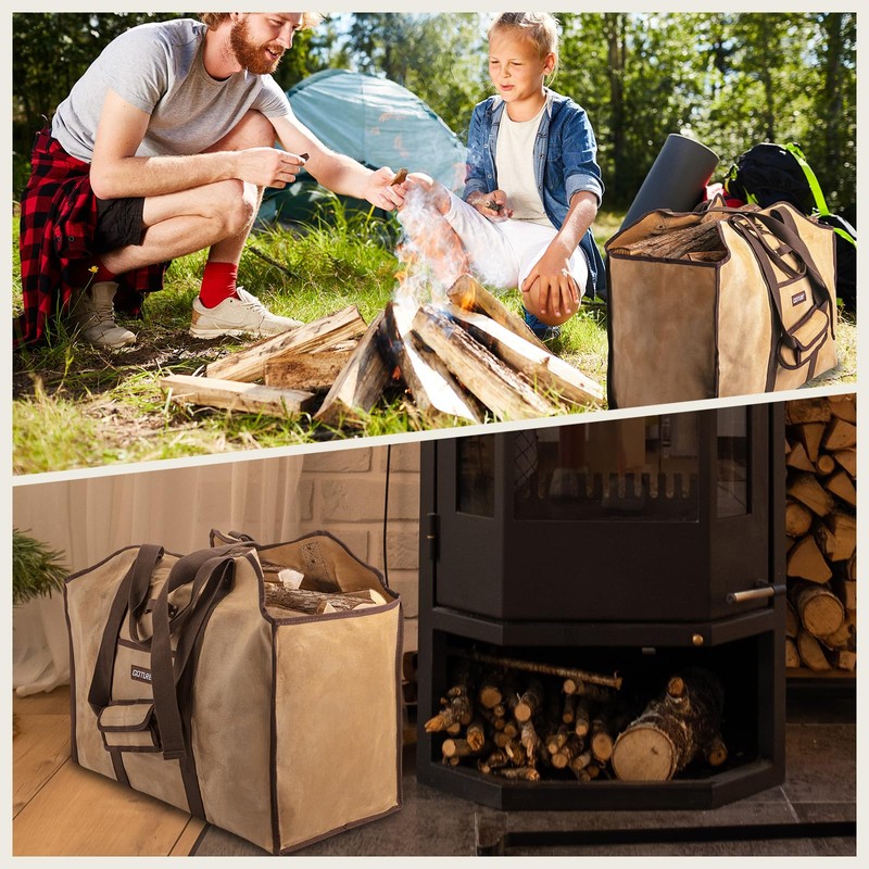 - Premium 20oz Waxed Canvas Construction: Crafted from high-quality 20oz waxed canvas, this firewood carrier is designed to withstand the elements. The waxed finish provides water and moisture resistance, keeping your firewood dry and protected even in damp conditions.