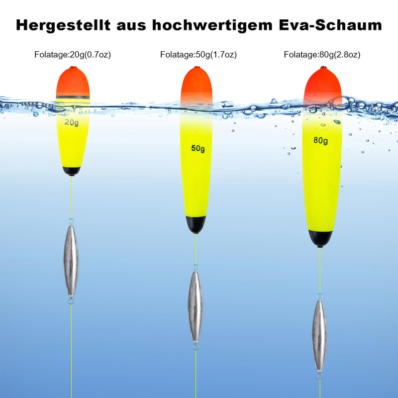 - MORE CHOICE - 10 Floatages to choose from: 10g, 15g, 20g, 30g, 40g, 50g, 60g, 80g, 100g, 120g. Simply thread the float stopper and fishing beads onto the line one by one, then thread the float onto the line. If you have any problem, please contact our customer service and we will reply you within 24 hours.
