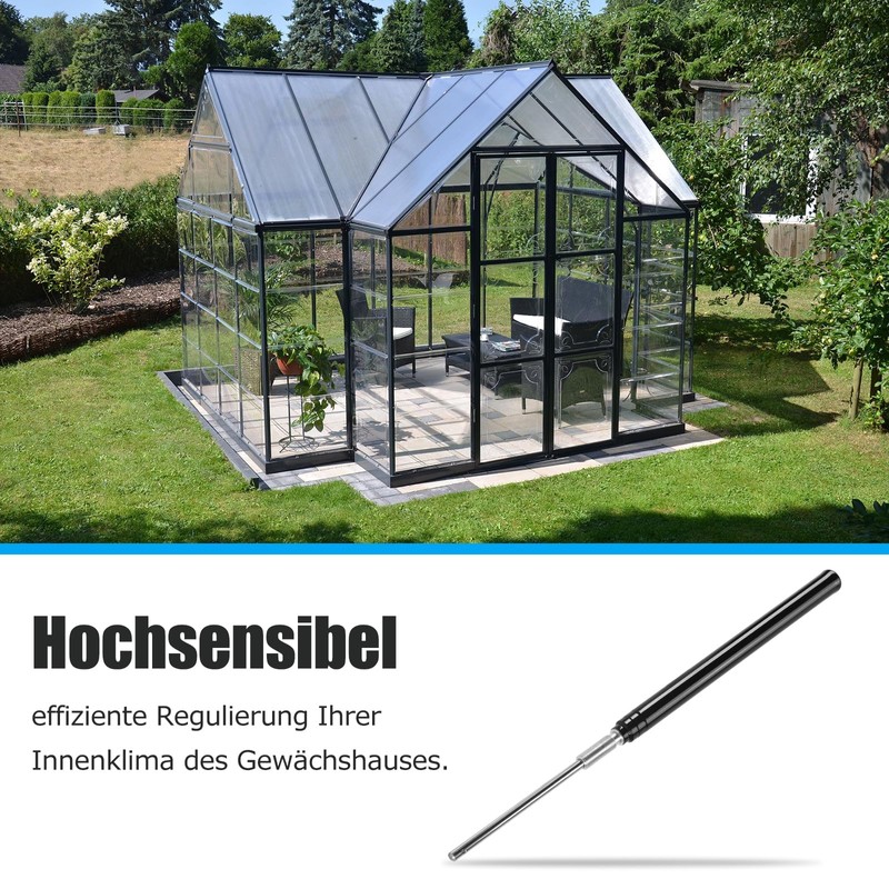 • TEMPERATURE DEPENDENT VENTILATION Our automatic window opener reacts to temperature changes and efficiently regulates the internal climate of your greenhouse. As the temperature rises, the gas-filled cylinder expands and opens the window gently. Once the temperature cools, the spring mechanism closes the window smoothly.