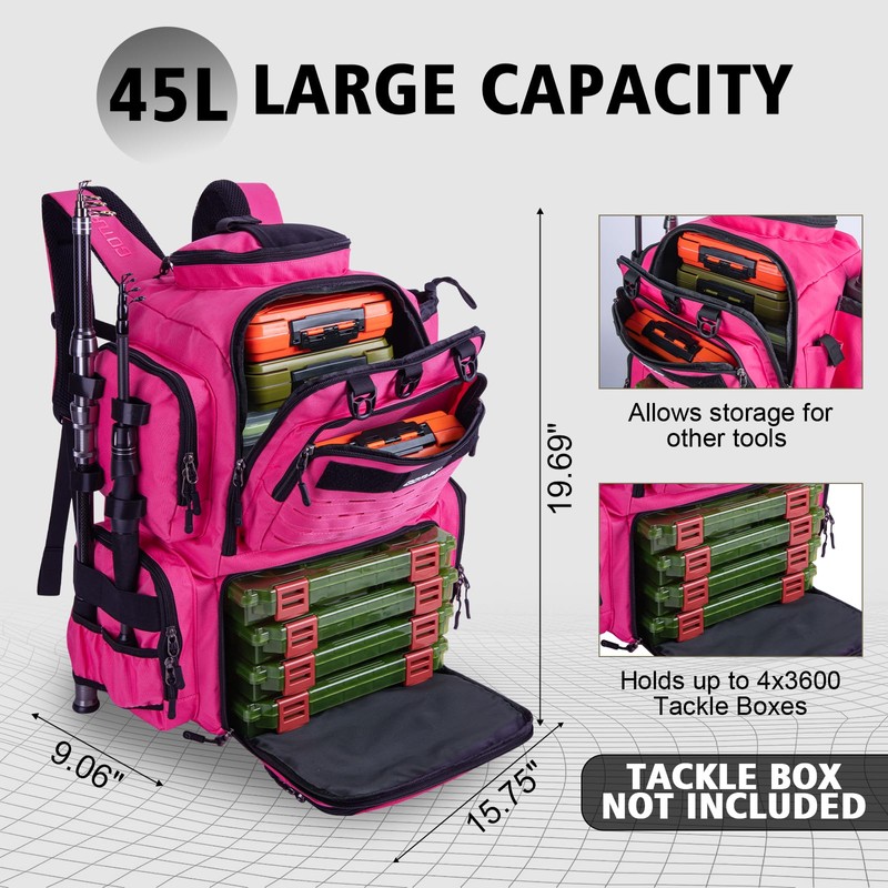 - Multi-Functional Storage Pockets: The fishing bag offers a 45L capacity with a large main compartment that fits fishing boxes, clothing, and larger essentials. The fishing tackle backpack also features a sunglasses pocket on the top of the backpack, a water bottle pocket, 2 fishing rod fixing straps, 2 pliers pockets, a mesh pocket, and 8 zipper pockets for organized storage