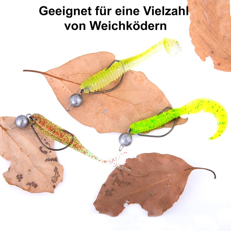 - WIDE SPLIT DESIGN The offset shaft and wide gap of these hooks provide secure grip and allow for easy setting of hooks. Our round jig heads for bass fishing can be combined with various soft plastic baits, allowing you to adapt to changing fishing conditions and preferences