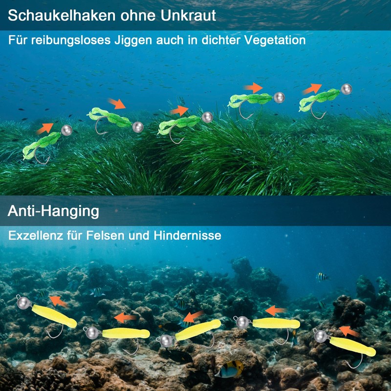- ENHANCED SWIMMING ACTION OF LURE:The jig head adopts an innovative design that gives the lures lifelike movements, mimics prey and easily attracts predatory fish. Good performance when snagging in dense grass and on obstacle surfaces