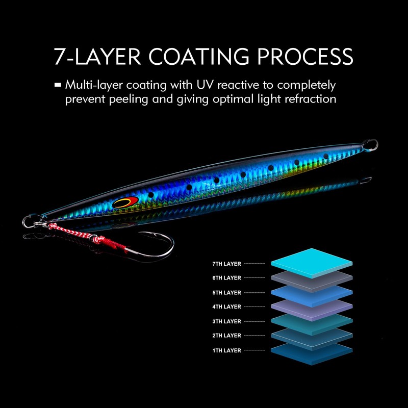 - 7-Layer Coating Process: Multi-layer painting process greatly increases the adhesion of paint to prevent peeling and keeps the speed jigs high brightness and high reflectivity which stimulates fish’s vision and helps distant fish locate the jigging lure quickly.