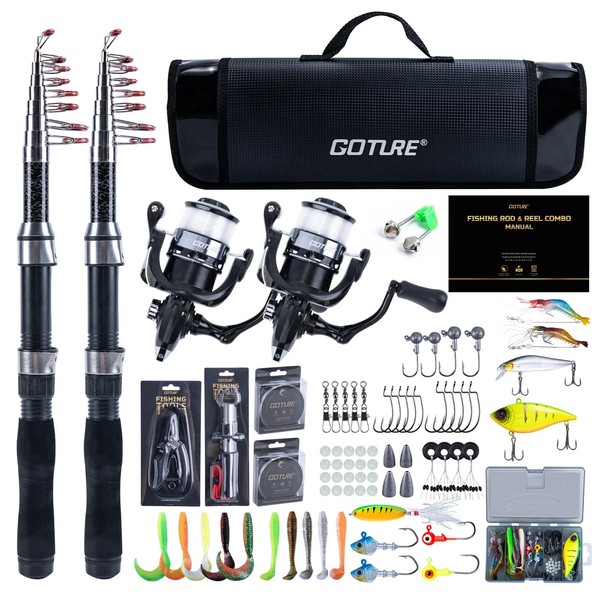Goture Fishing Rod and Reel Combos-2PCS Telescopic Fishing Pole+2PCS Pre-Loaded Spinning Reels with Carrier Bag, Telescopic Rod Reel Lures Kit for Starter Travel Saltwater Freshwater