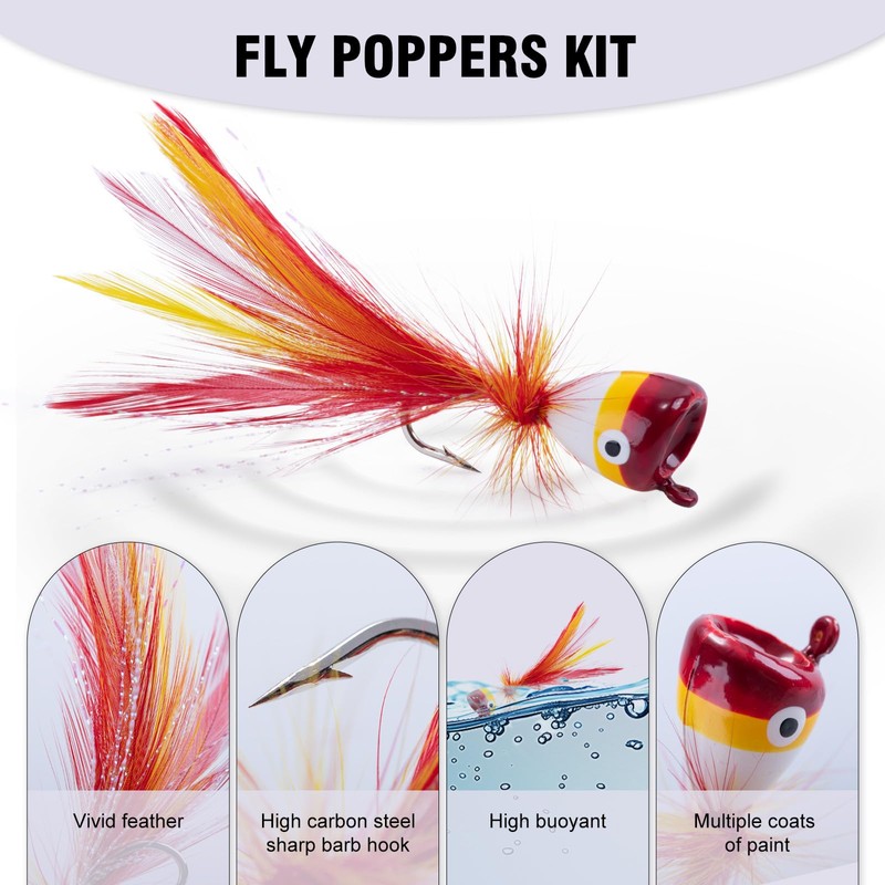 - Good Choice: There are 18pcs poppers flys available, which can meet your daily fishing needs. You can also share with your friends. It is a great fly fishing flies kit for both beginners and experienced anglers