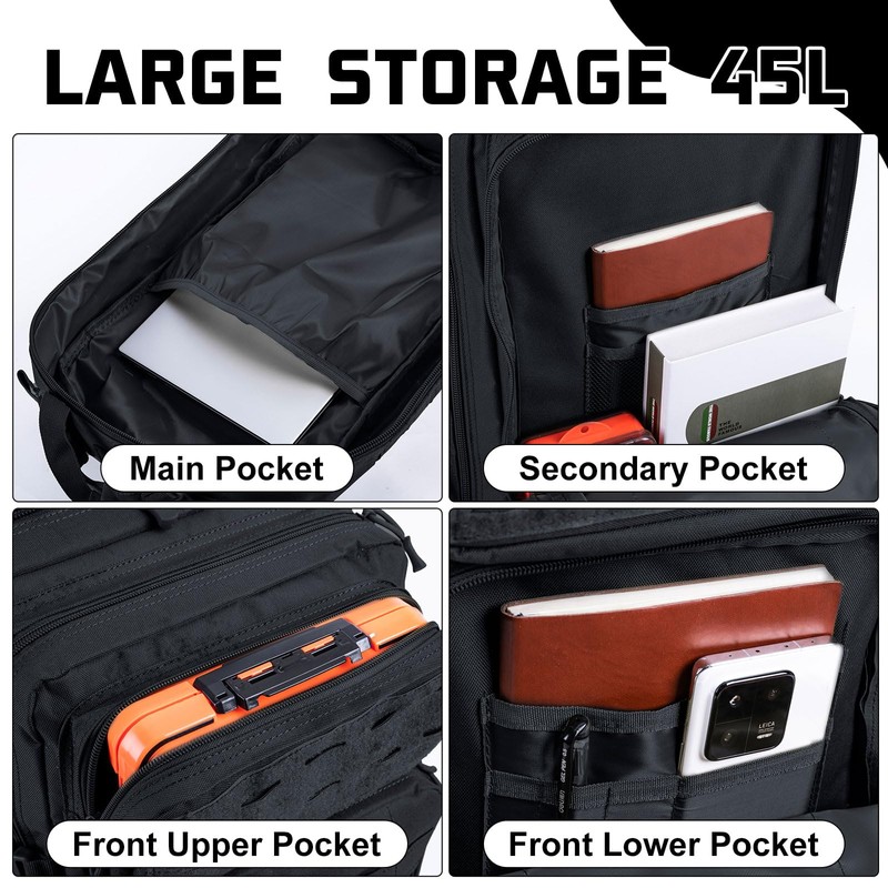 - Spacious and Versatile: This tactical assault pack has 2 large compartments, 2 small compartments in front, and a back compartment for a hydration bladder. This military backpack is perfect for carrying a variety of items such as personal belongings, clothing, and books—all conveniently organized in one bag