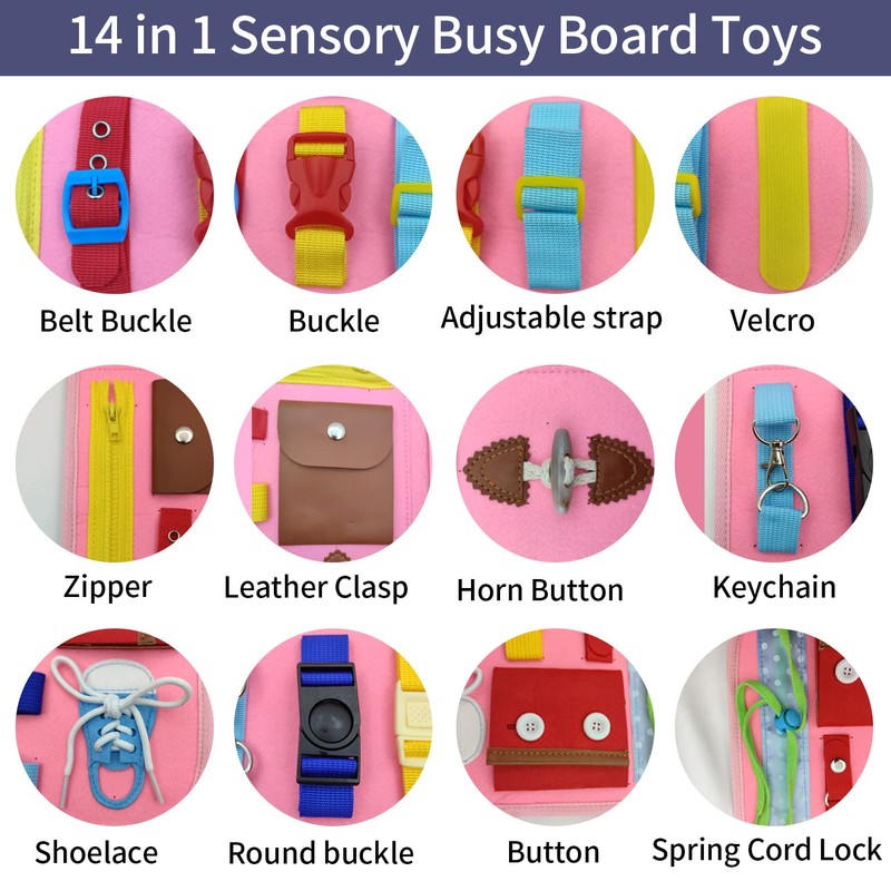 This Montessori sensory toy can train children's finger flexibility, help them develop fine motor skills, cognitive skills and hand-eye coordination, there are a total of 14 different early skills. Accordingly, children can practice adaptability in everyday life preschool education.