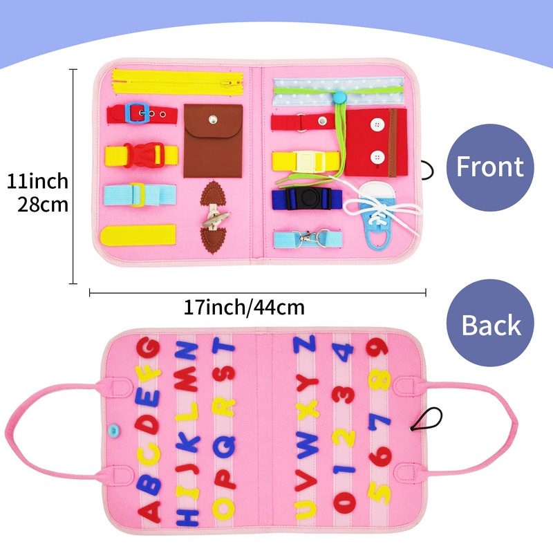 • Developing basic life skills: This multifunctional toddler activity board contains 14 different accessories, zips, adjustment buckles, buttons, Velcro fasteners, press studs, elastic bands and shoelaces, etc. It also includes letters and numbers (36 Velcro, A-Z, 0-9). It is suitable for a wide range of life scenes and for learning practical skills.