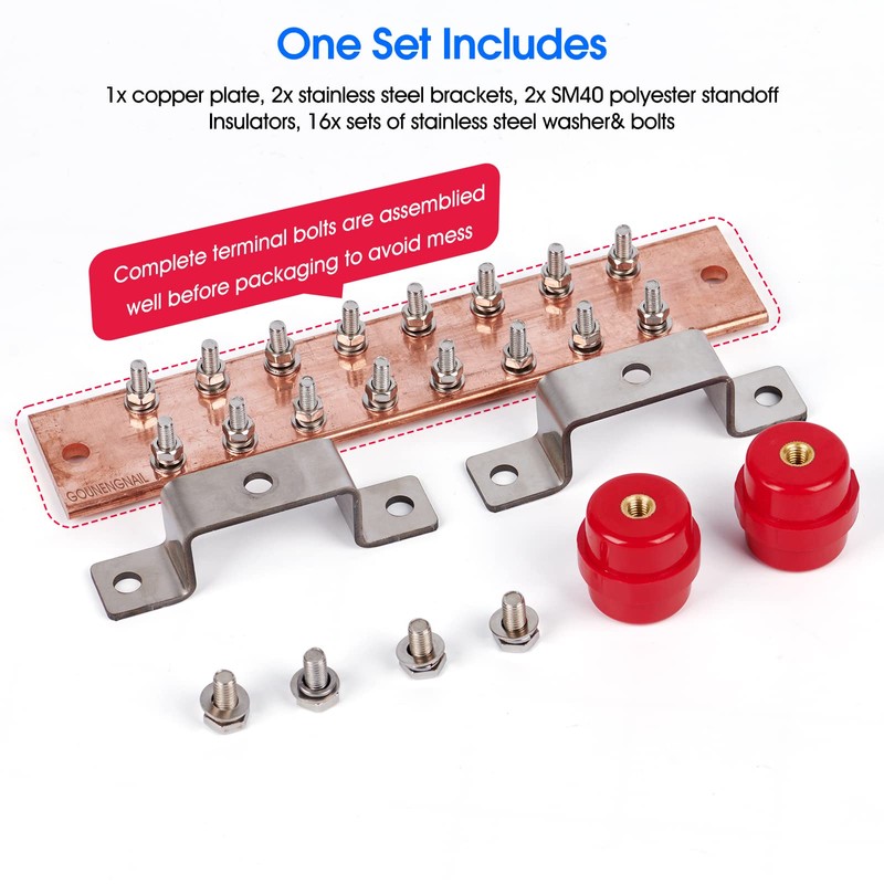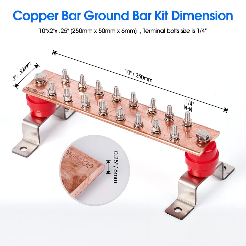 • GOUNENGNAIL branded Copper Ground Bar 1/4"(metric 6mm thick) x 2" (Metric 50mm wide) x 10" (metric 250mm long) with 1/4'' * 16 Terminal Positions. With SM40 polyester insulators made from UL material - QMFZ2.E252110,Rated Uimp up to 7.4kV.