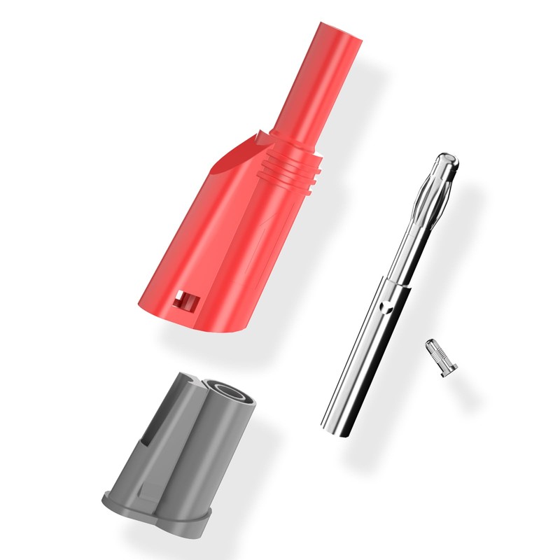 - Solderless: First pass the bare wire through the gray base. Then through the 4mm jack of the banana plug, then insert the screw from the end of the banana plug, tighten the screw, and finally put on the shell.