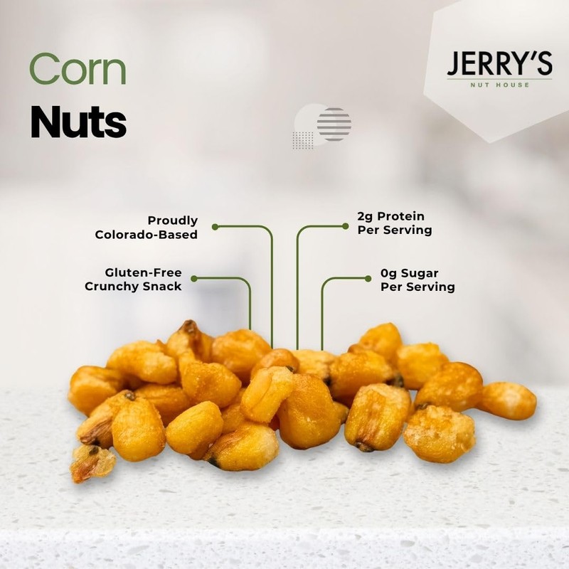• Gourmet Corn Nuts, Roasted & Salted: A crave-worthy classic from Jerry’s Nut House, delivering bold flavor and satisfying crunch in every bite.