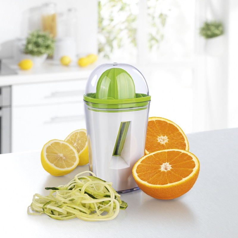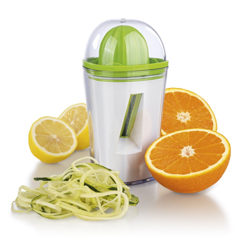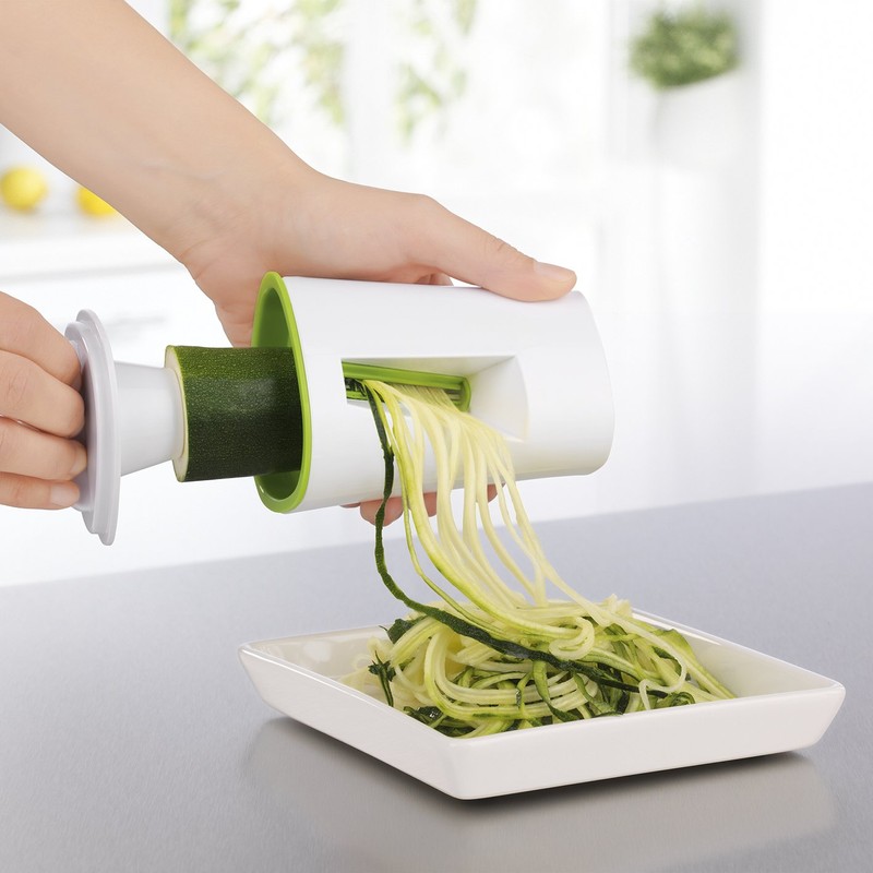 • Spiral cutter for appetizing raw food salads, vegetable noodles and much more.