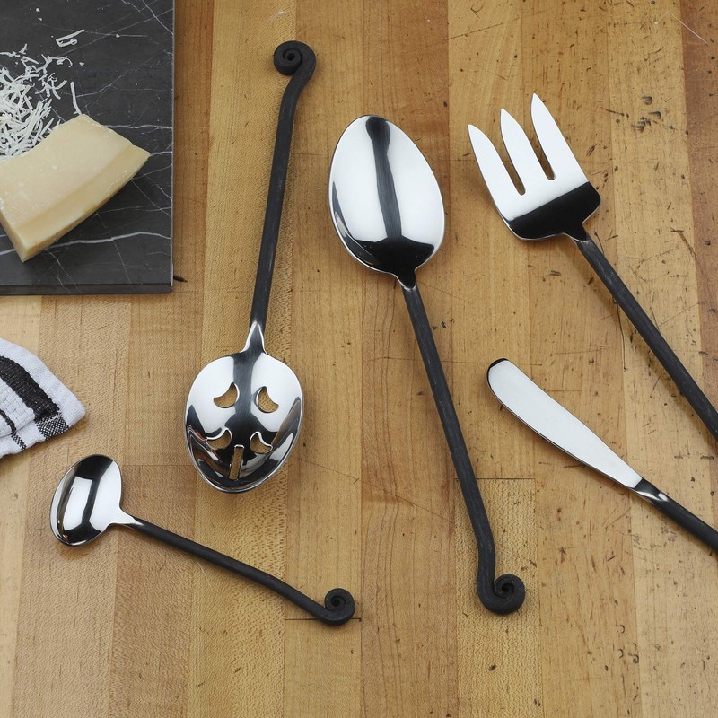 With its natural shaping and distinctive finishes, Treble Clef flatware has an artisanal quality that makes for an intimate, earthy feel at the table. Heat- forged for durability, the pattern features contoured handles that end in a curl reminiscent of the scroll of a violin. The mirror-finish working ends are bright and smooth, while the handles are blackened for a rustic effect. Ideal for casual entertaining, the pattern is also a great daily choice for playful spirits.