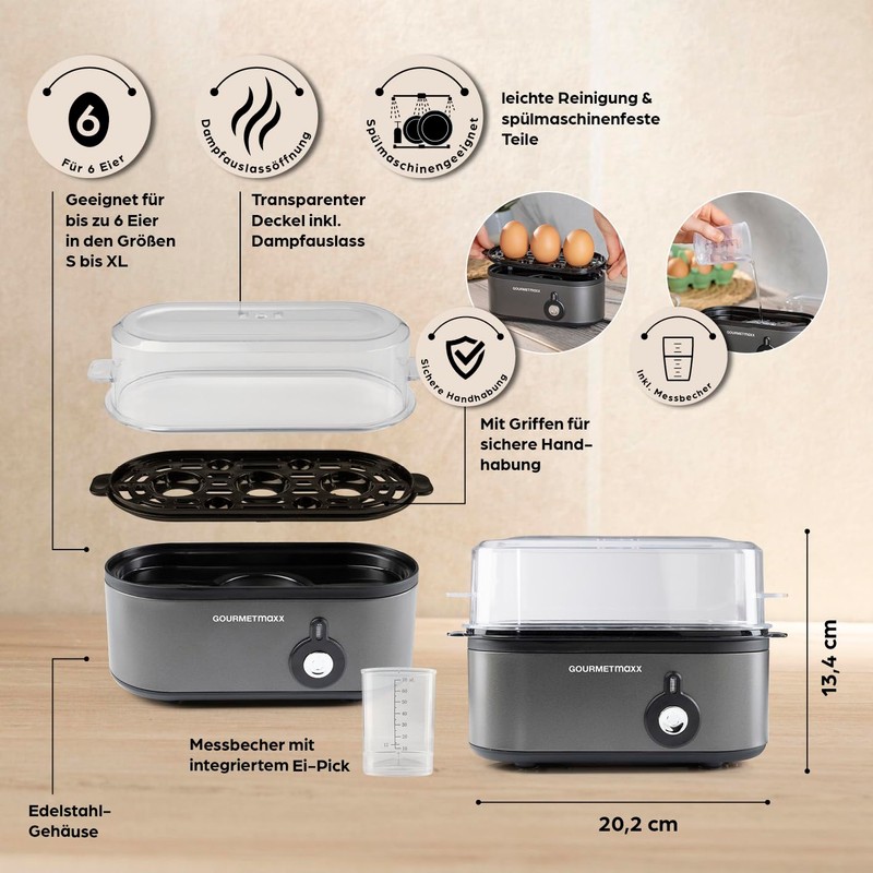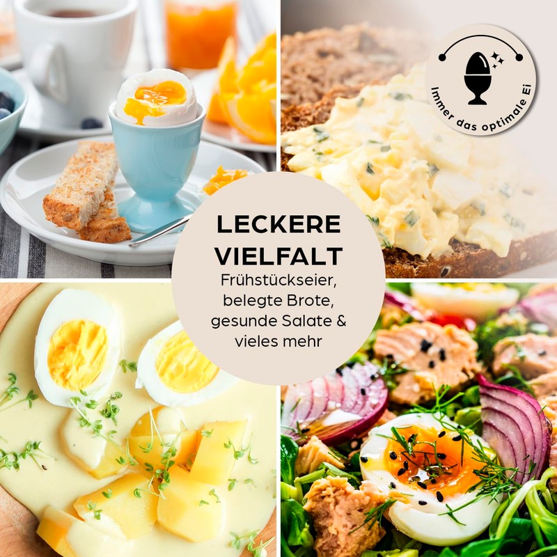 Was wäre ein ausgiebiges Frühstück ohne Brötchen, Obst, Müsli, Pfannkuchen – und natürlich perfekt gekochte Eier? Verzichte auf Herd und Kochtopf und hol dir den cleveren GOURMETmaxx Design-Eierkocher für 3 Frühstückseier. Denn so genießt du einfach überall dort köstliche Eier, wo du eine Steckdose findest. Schneller und leichter geht Eierkochen kaum! Fülle einfach mit dem beigefügten Messbecher die optimale Wassermenge für deinen gewünschten Härtegrad – weich, mittelhart oder hart – in den Eierkocher ein, platziere die Eier und starte den Kochvorgang mit nur einem Knopfdruck. Dank transparenter Abdeckhaube mit praktischem Dampfauslass hast du nicht nur den Kochvorgang im Blick, sie verhindert auch einen möglichen Überdruck und sorgt dafür, dass deine Frühstückseier schön gleichmäßig kochen. Kleiner Tipp: Piekse die Eier vor dem Kochen mit dem integrierten Eierstecher an. So kannst du das lästige Platzen der Schale besser vermeiden. Wenn du den Signalton hörst, kannst du die Eier auch schon herausnehmen. Und die Reinigung? Superleicht! Einfach die entnehmbaren Teile (Deckel, Eierhalter und Messbecher) feucht abwischen oder in die Spülmaschine geben. So bleibt dir mehr Zeit zum Genießen. Der kompakte GOURMETmaxx Design-Eierkocher für 3 Eier der Größe S–XL – platzsparend verstaubar und ideal geeignet für Campingtouren, Ausflüge & Co.