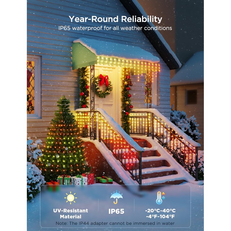 - Built to Last: Govee Christmas tree lights are IP65-rated and made from anti-UV material. Whether rain, shine or snow, enjoy light shows from -4F to 104F. (Note: The IP44-rated adapter cannot be immersed in water)