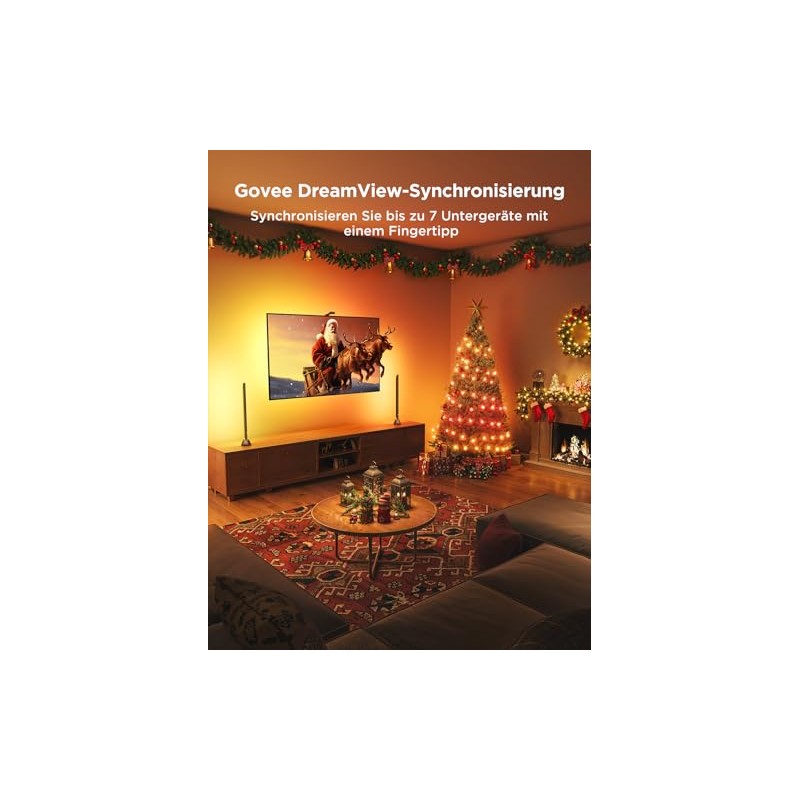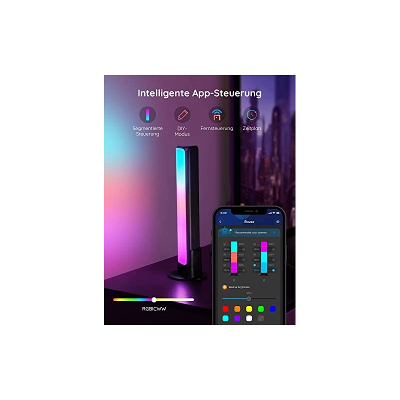 - Intelligente App-Steuerung: Legen Sie Segmentfarben und -helligkeit fest, gruppieren Sie die Gaming Light nach R?umen, automatisieren Sie Tagespl?ne und entdecken Sie weitere Effekte, die von Nutzern in der Govee-Community entwickelt wurden.