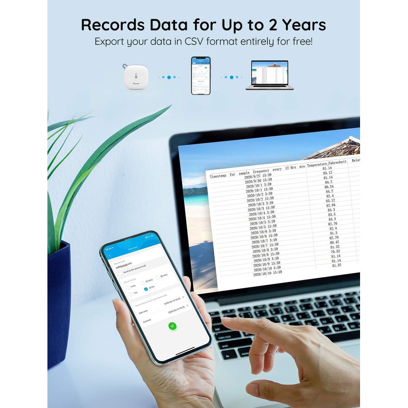 - Data Storage & Export: Our WiFi temperature sensor uploads data to the App when connected via Bluetooth or WiFi. Enjoy 20 days of online data storage view and export up to 2 years' worth of data seen through clear historical trends and graphs.