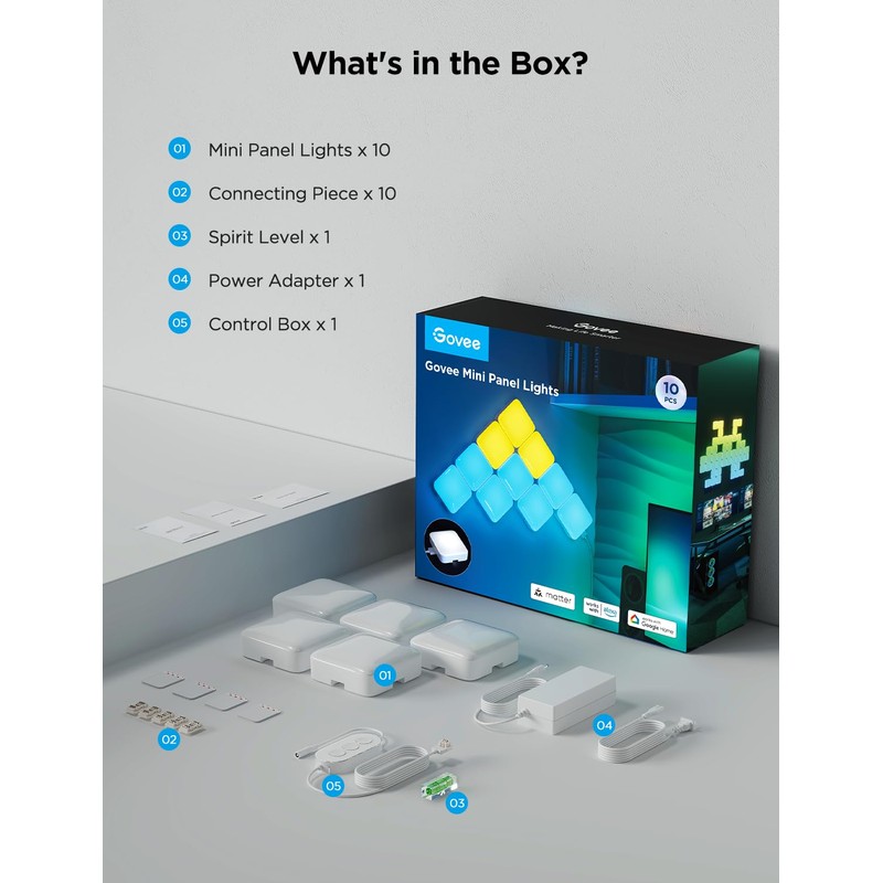 - Expansion & Splicing Support: A single adapter can connect up to 70 light panels. Through Govee Home App, you can personalize each light panel to achieve pixel art effects.