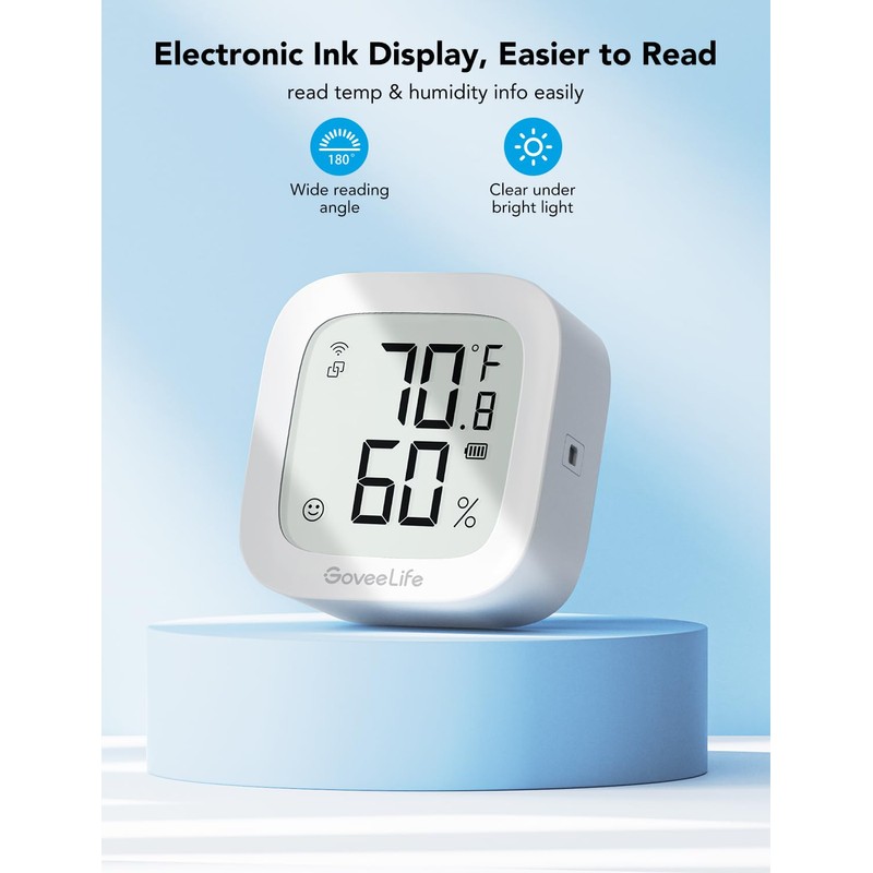 - Easy to Read Display: Govee WiFi Thermometer Hygrometer uses an electronic ink screen that's easy to read. Check the current temperature and humidity via the app. With low battery consumption, your digital thermometer hygrometer will last for up to half a year.