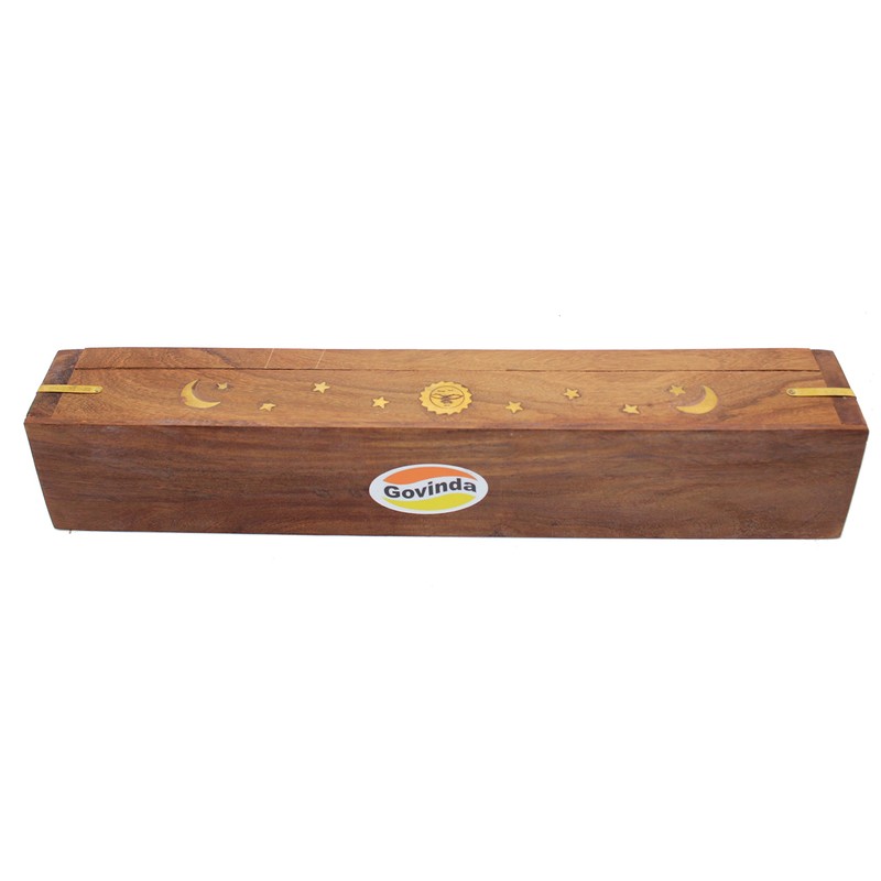 Govinda Wooden Coffin Incense Burner - 12" Sun Moon Star - Brass Inlays - Storage Compartment …