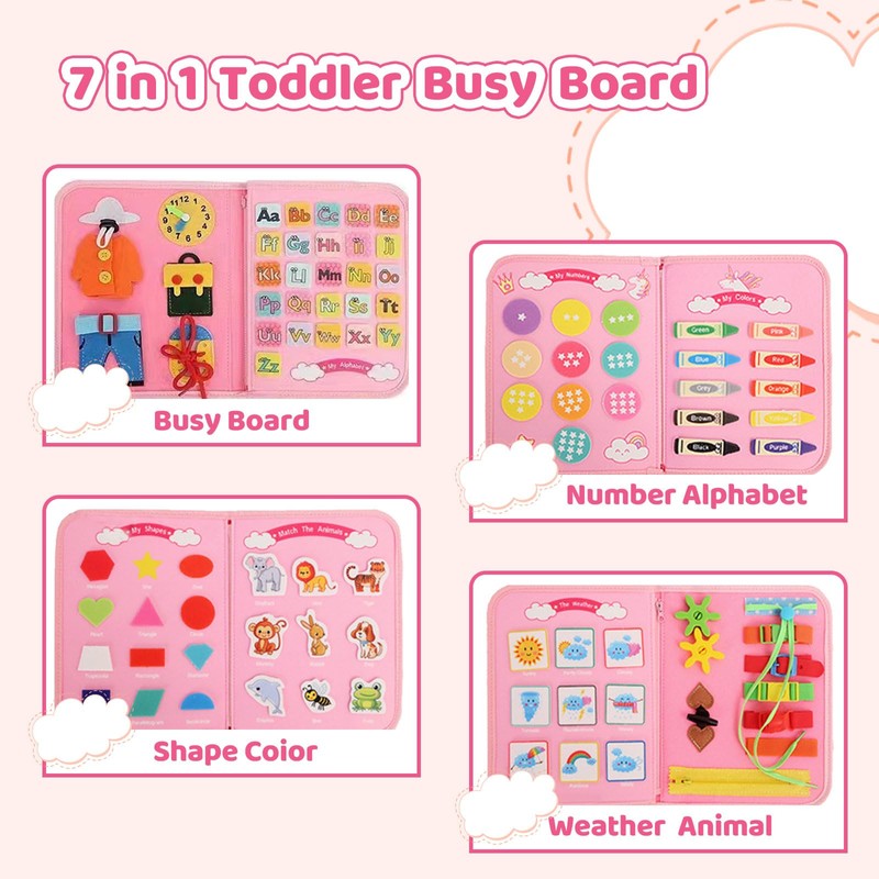 - 💖【7 in 1 Busy Board】Goviox Busy Board für Kleinkinder ist das perfekte Lernspielzeug für 1-4 Jahre. Mit seinen 7-in-1-Aktivitäten fördert es die kognitiven Fähigkeiten, lebenspraktische Fertigkeiten und die Entwicklung der motorischen Fähigkeiten. Vom Zahlen, Buchstaben, Farben, Formen, Tiere, Wetter bietet unser Beschäftigungsbrett fesselnde Lernerfahrungen.