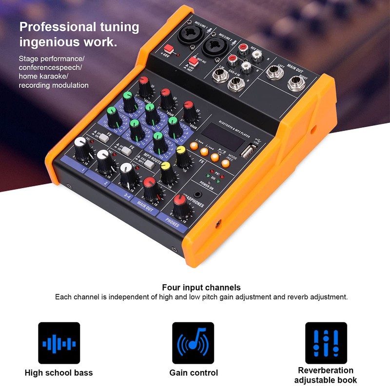 - 4 input channels, each channel is independent, capable of treble and bass adjustment, gain adjustment and reverb adjustment.
