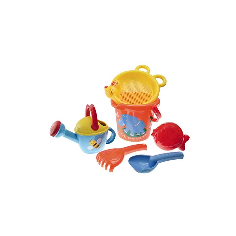 - Das Set besteht aus einem Eimer mit Elefantenmotiv, einem Sieb in Mausoptik, einer Gießkanne, einem Rechen sowie einer Schaufel und einer Sandform, somit steht dem Spaß in der Sandkiste oder am Strand nichts mehr im Wege.