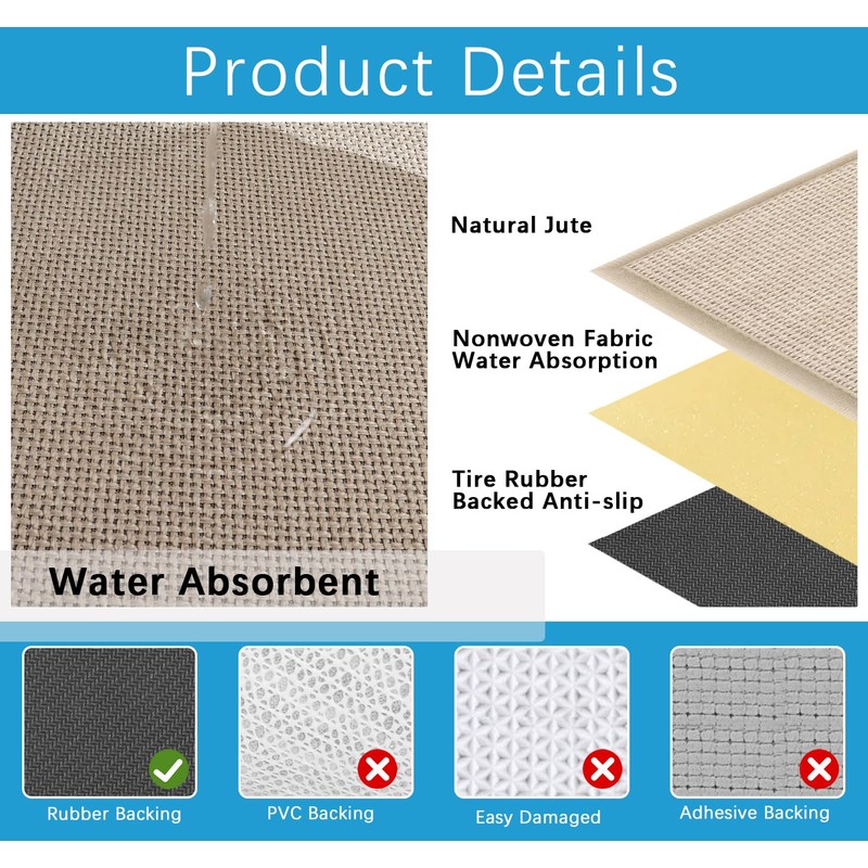 - Water Absorbent: Jute hall mat with absorbent non-woven fiber fabric inter layer to provide the runner rugs with strong water absorption, for the surface of long runner mat are made of low pile jute, so hallway runner will not be entangled with the sweeping robot, then you can open and close the door arbitrarily, just put the thickness 0.3" of runner behind the door.