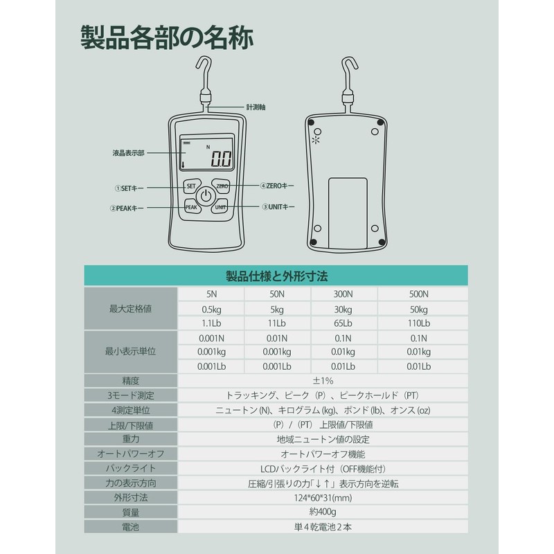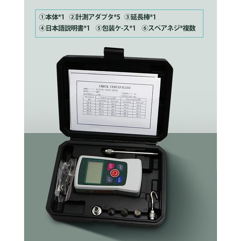 - [1 year warranty/package] 1 year warranty and our shop contact method: "Account service" → "Order history" → "Seller" → "Ask questions" in your account service. You can provide support 7x7. Package Contents: 1 main unit, 2 measuring adapters x 6 (hook differs depending on strength, 5/50 N thin, 300/500 N thick), 3 spare screws x multiple 4 AAA batteries x 2, 5 Japanese instruction manual (English language not guaranteed), 6 packing case