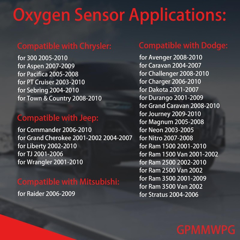 - More Application: oxygen sensor compatible with Chrysler for 300 2005-2010, for PT Cruiser 2003-2010, for Sebring 2004-2010; Compatible with Jeep for Commander 2006-2010, for Grand Cherokee 2001-2002&2004-2007, for Liberty 2002-2010, for TJ 2001-2006, for Wrangler 2001-2010; Compatible with Mitsubishi for Raider 2006-2009. For more applicable vehicles please check the picture or use the Automotive Part Finder by selecting the model