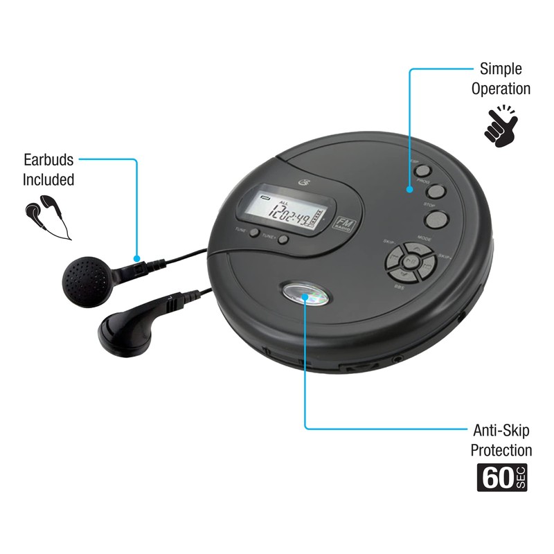 GPX PC332B Portable CD Player with Anti-Skip Protection, FM Radio and Stereo Earbuds - Black
