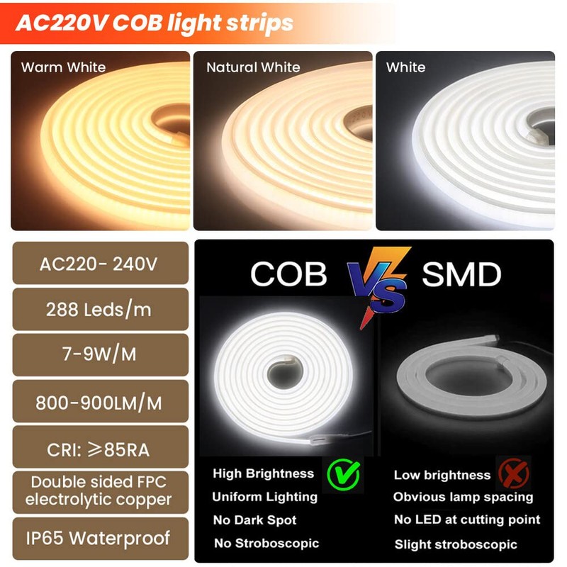 GQL Flexible COB Neon Light Strip, 220V LED Strip 288 LEDs/m, Cut to 50cm, IP65 Waterproof Modified Silica Gel Rope Light with UK Plug Power Supply (1m, Blue)