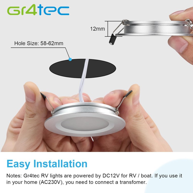 - 12mm Ultra-Dnn: Mit einer Installationsh?he von nur 12 mm ist die Gr4tec einbauspot 12v leicht und kompakt, ideal fr die Installation in engen R?umen. Der Durchmesser des 12v led spot betr?gt 70 mm und passt in ein Loch von 58-62 mm.