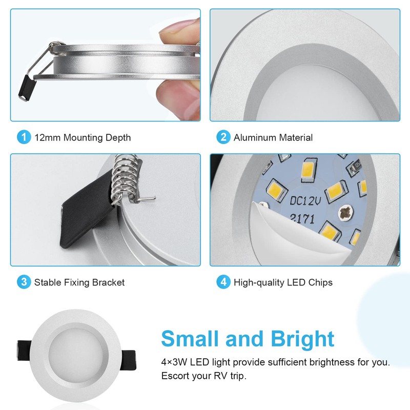 Gr4tec Gr4tec LED Einbaustrahler 12V Dimmbar, 4 x LED Spots IP44 Warmwei? 3000K 3W 84Ra, M?beleinbauleuchte LED Silber, Deckenspots 12mm Ultra Flach, Einbauleuchten fr Wohnmobil Wohnwagen, Loch 58-62mm