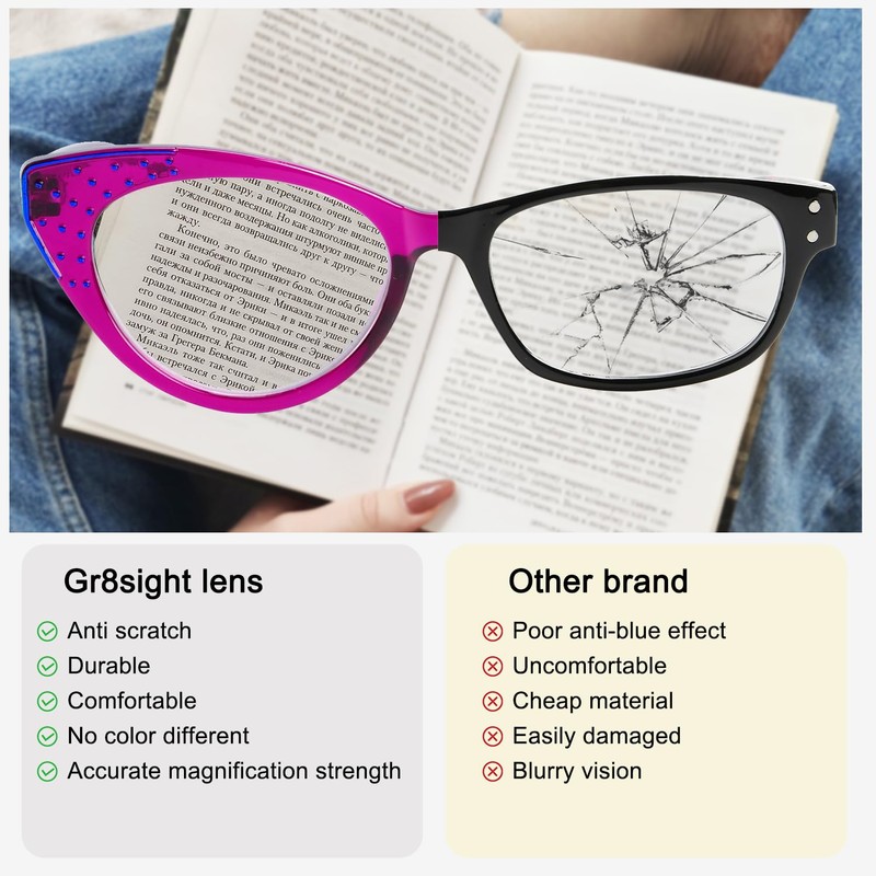 - Clear vision: The magnification strength in the Gr8sight women cheaters are accurate, providing clear vision. Made from quality and crystal clear material, they easily enable you to read small texts and minute details without stress.