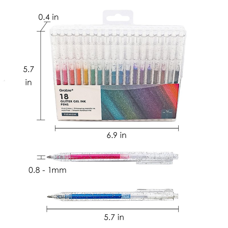 - Unleash your creativity and add a touch of sparkle to your artistic endeavors with Grabie Glitter Gel Pens. With a stunning array of 18 vibrant colors packed with shimmering glitter, these pens ignite the imagination with brilliant shades of the rainbow.