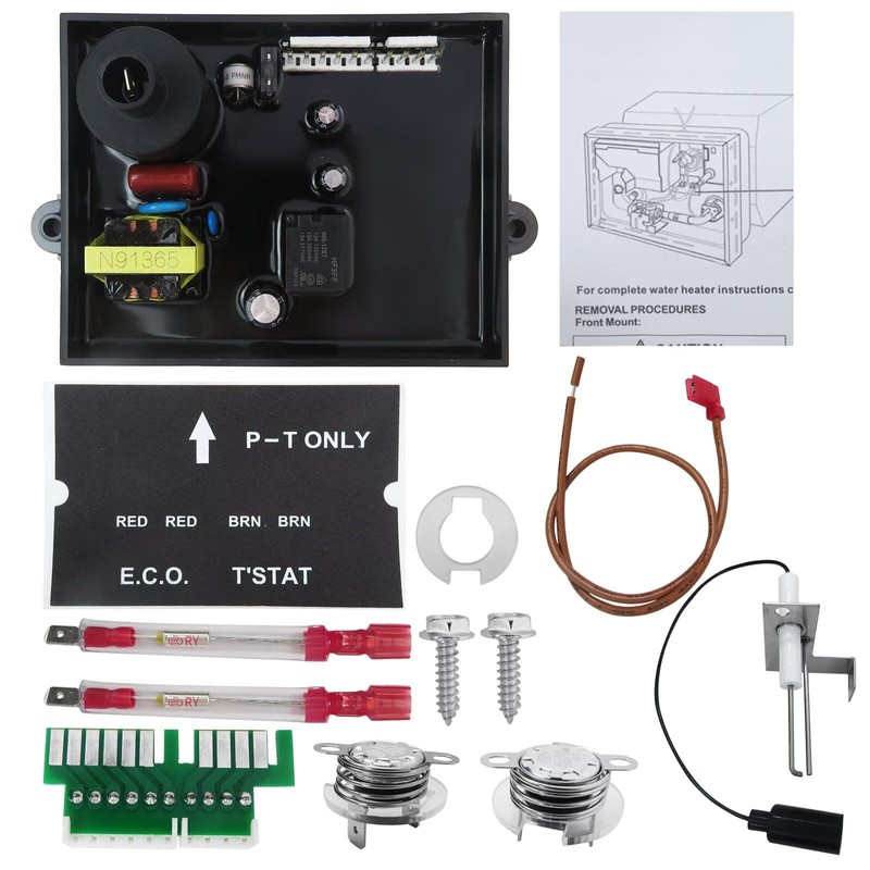 Includes 91365 Circuit Control Board, 91447 Thermal Cut Off & ECO Thermostat and 93868 Spark Igniter Electrode. A complete replacement solution for fixing ignition and heating issues in RV water heaters