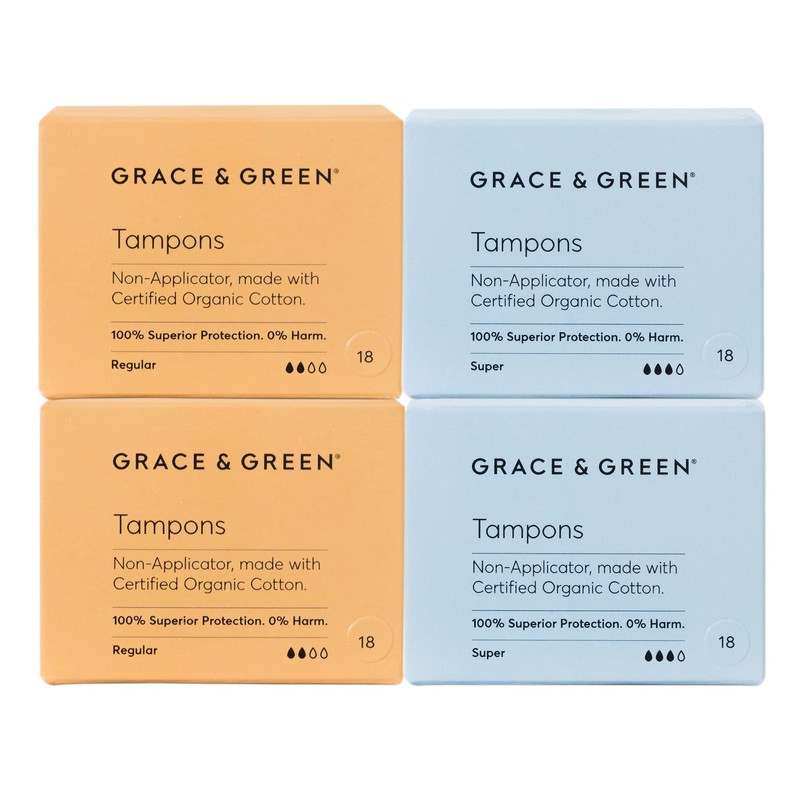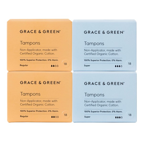 - PLASTIC FREE, 100% ORGANIC TAMPONS: When it comes to your intimate hygiene, you should be able to trust that your feminine hygiene products will not contain toxic materials, pesticides, fertilizers, or harmfully processed materials. Grace & Green have created a range of women's period products that are made with only pure, premium, certified organic cotton, for a gentle, safe period with no compromise on quality. This pack contains 36x tampons regular and 36x Super tampons.