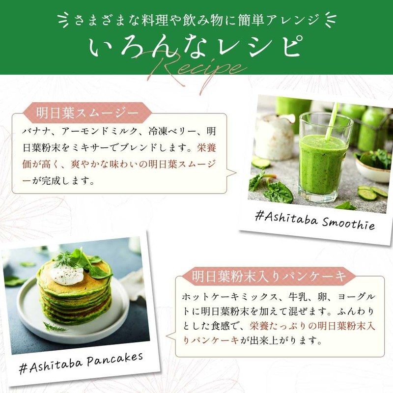 • 【お召し上がり方】お水やお湯に溶かして手軽に明日葉茶として飲むことができます。また、スムージーやヨーグルトに混ぜても。手軽にお料理の栄養価を高めることができます。