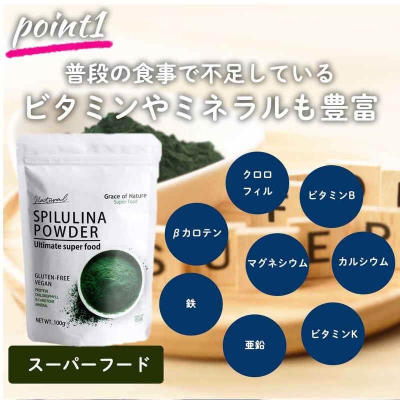 - (Plenty of natural pigment ingredients with reduced effects. Spirulina contains the unique pigment ingredient, "ficosicanin", "beta-caroten", "chlorophylina", and "zeaxanthin", which exhibits strong reduction in green and yellow vegetables