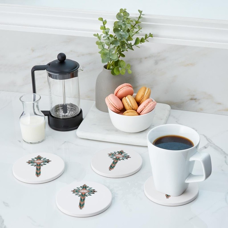 Grace & Truth Decorative Round Coaster for Drinks 4 Inch Absorbent Ceramic with Non-Scratch Cork Backing Southwestern Cross Set of 4