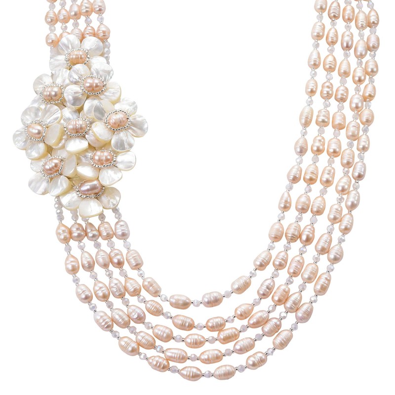 Graceful Cultured Freshwater Pearl and Crystal Bead Floral Cluster Statement Necklace