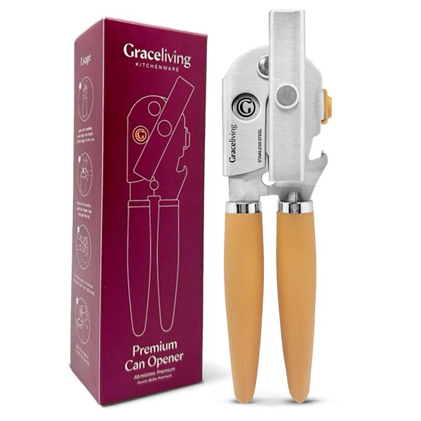Graceliving Premium Multifunctional Magnetic Manual Can Opener and Bottle Opener, Heavy Duty Stainless Steel Sharp Cutting Blade and Oversized Easy Turn Knob, Soft-Touch Handle, Kitchen Use, Orange